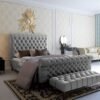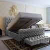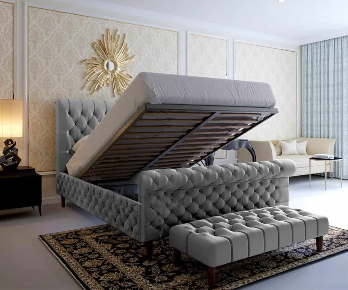 The bed features a beautifully crafted scroll-style headboard and footend, adorned with deep button tufting that adds an extra layer of refinement. Beyond its striking design, the Maya bed also offers the option of integrated ottoman gas-lift storage—providing generous space for storing bedding, clothing, and other essentials discreetly.